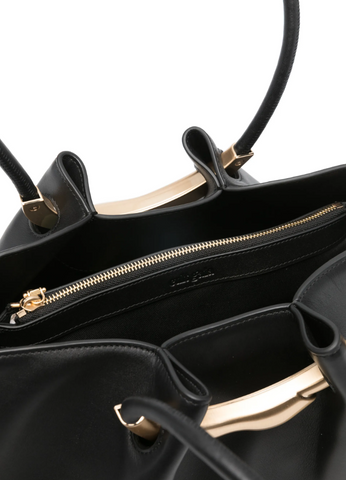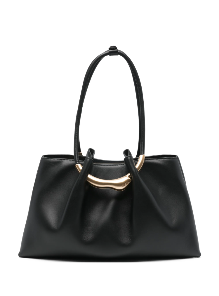 A smooth leather satchel with corded straps looped through abstract gold-toned hardware, shaped into a soft, wide silhouette with structured interior organization.