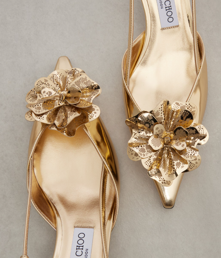 Mimmi Sling Back 50 - Gold Liquid Metal Leather Slingbacks with Jimmy Choo Perforated Corsage